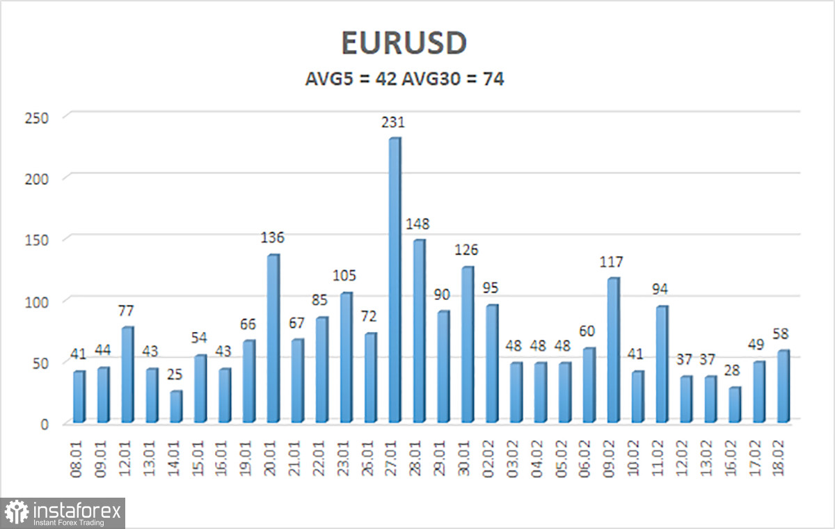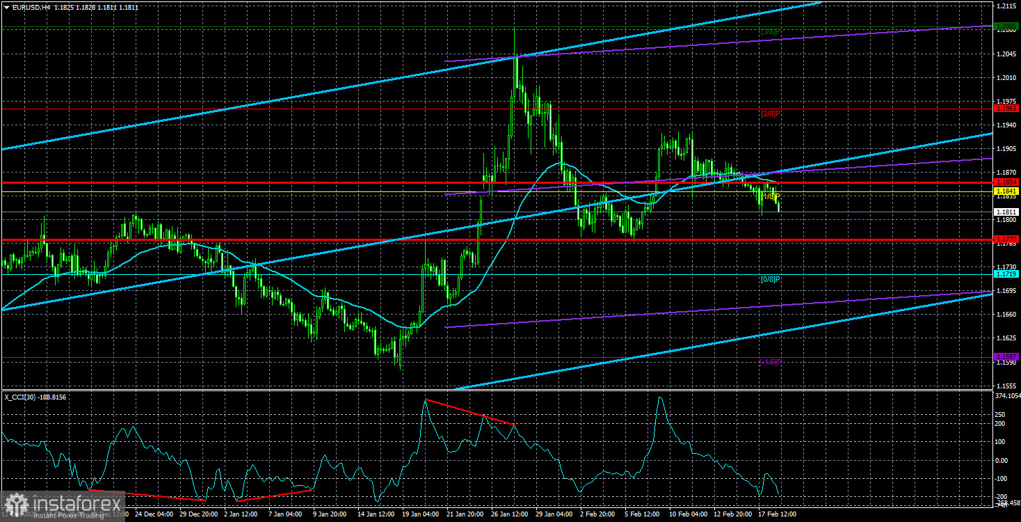 Средняя волатильность валютной пары EUR/USD за последние 5 торговых дней по состоянию на 19 февраля составляет 42 пункта и характеризуется, как «низкая». Мы ожидаем движение пары между уровнями 1,1770 и 1,1854 в четверг. Старший канал линейной регрессии направлен вверх, что указывает на дальнейший рост евровалюты. Индикатор CCI заходил в область перекупленности, что предупредило о нисходящей коррекции.