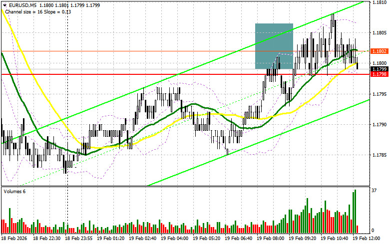 В своем утреннем прогнозе я обращал внимание на уровень 1.1798 и планировал от него принимать решения по входу в рынок. Давайте посмотрим на 5-минутный график и разберемся с тем, что там произошло. Рост и формирование ложного пробоя в области 1.1798 привели к точке входа на продажу евро, однако до крупного падения пары дело так и не дошло. На вторую половину дня техническая картина была пересмотрена.Для открытия длинных позиций по EURUSD требуется:Отсутствие важной статистики по еврозоне сказалось на волатильности пары EUR/USD