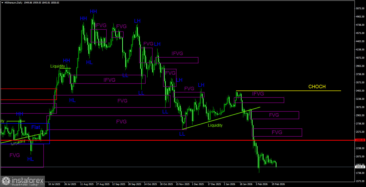 Биткоин продолжает формирование полноценного нисходящего тренда. Мы продолжаем ожидать падения с целью 57 500$(уровень 61,8% по Фибоначчи от трехлетнего восходящего тренда), а признаков разворота тренда в данное время ни одного. Но даже уровень 57 500$ теперь не выглядит, как конечная остановка. Из областей POI на продажу на дневном ТФ можно отметить последний «медвежий» FVG, до которого биткоину еще очень далеко. На 4-часовом ТФ областей POI на продажу нет. Сначала должен быть завершен флэт, а уже затем следует искать возможности для открытия коротких позиций.