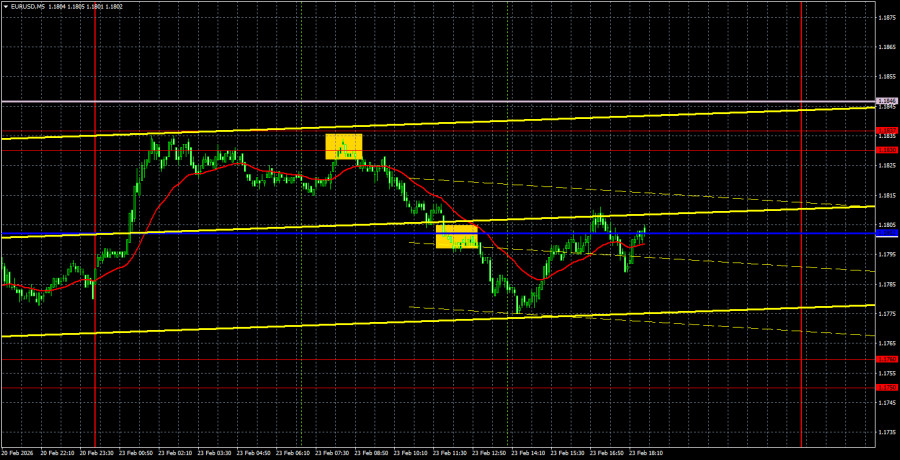 Торговые рекомендации и разбор сделок по EUR/USD на 24 февраля. Рынок не отреагировал на новые пошлины.