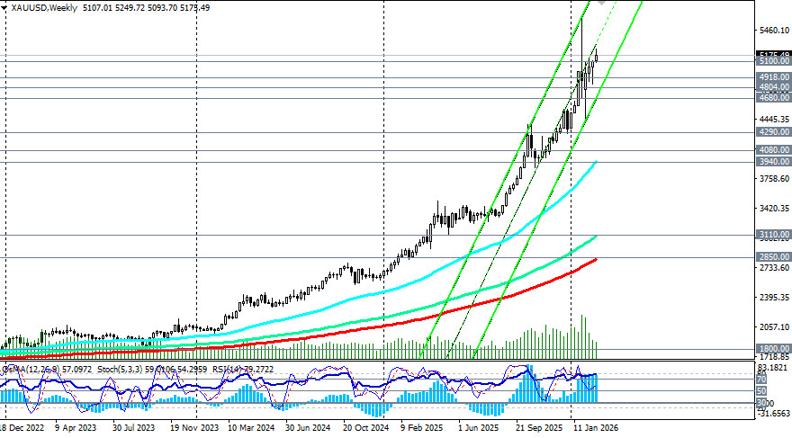 Второй день подряд XAU/USD торгуется в диапазоне 5150.00–5200.00. Попытки закрепиться выше 5200.00 пока не получают устойчивого продолжения, что отражает осторожность инвесторов перед ключевыми геополитическими и макроэкономическими событиями. Боковая динамика цены указывает на баланс двух сил спроса на защитные активы из-за геополитических рисков и поддержки доллара США на фоне пересмотра ожиданий по ставке ФРС, отметили мы в нашем сегодняшнем фундаментальном анализе и обзоре «XAU/USD: на фоне геополитики и тарифных рисков». Несмотря на текущую консолидацию, более широкий восходящий тренд сохраняется. После