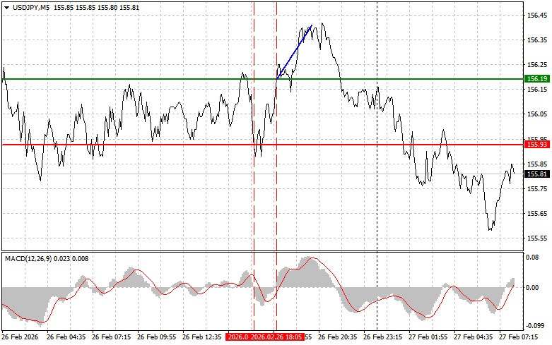 Разбор сделок и советы по торговле японской иенойТест цены 156.19 пришелся на момент, когда индикатор MACD только начинал движение вверх от нулевой отметки, что стало подтверждением правильной точки входа на покупку доллара. В результате пара выросла на 20 пунктов.Как показали сегодняшние данные, индекс инфляции в Токио снизился, поскольку субсидии на коммунальные услуги, введенные премьер-министром Санаэ Такаичи, снизили расходы домохозяйств на энергию, что создает проблемы для Банка Японии в преддверии дальнейшего повышения процентных ставок. Снижение инфляции, отраженное в последнем индексе потребительских