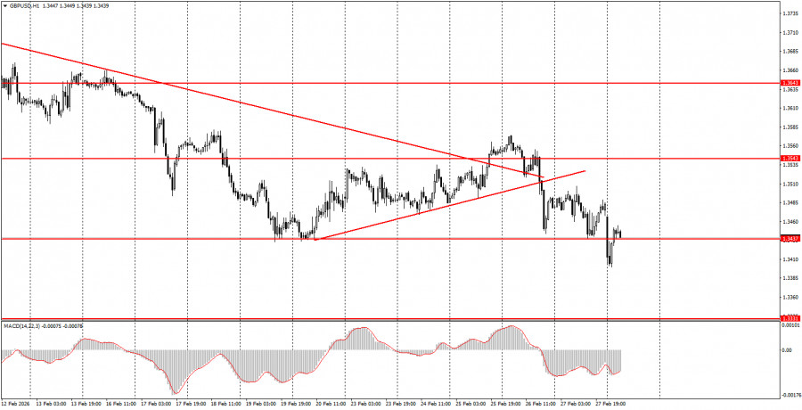 Разбор сделок пятницы: 1Н график пары GBP/USD. Пара GBP/USD в течение пятницы в четвертый раз снизилась к уровню 1,3437, а в понедельник ночью преодолела его. Таким образом, восходящая тенденция закончилась, даже не начавшись. Рынок еще в конце прошлой недели начал вновь проявлять повышенное внимание к доллару, так как обстановка на Ближнем Востоке накалилась до предела. Переговоры в Женеве в четверг между Ираном и США провалились, и в тот момент стало ясно, что война в Иране –