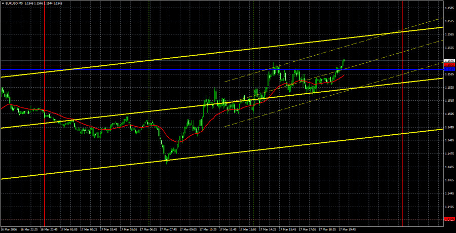 Анализ EUR/USD 5M. Валютная пара EUR/USD в течение вторника продолжала восходящее движение и фактически преодолела нисходящую линию тренда. Напомним, что это не первый раз за последние полтора месяца, когда нисходящая линия тренда пропускает цену выше себя. В предыдущих случаях восходящий тренд не начинался. Однако ничто не вечно. В том числе поддержка доллара единственным фактором геополитики. В последние недели мы регулярно говорили о том, что у доллара нет никаких других факторов поддержки, кроме геополитики. И если