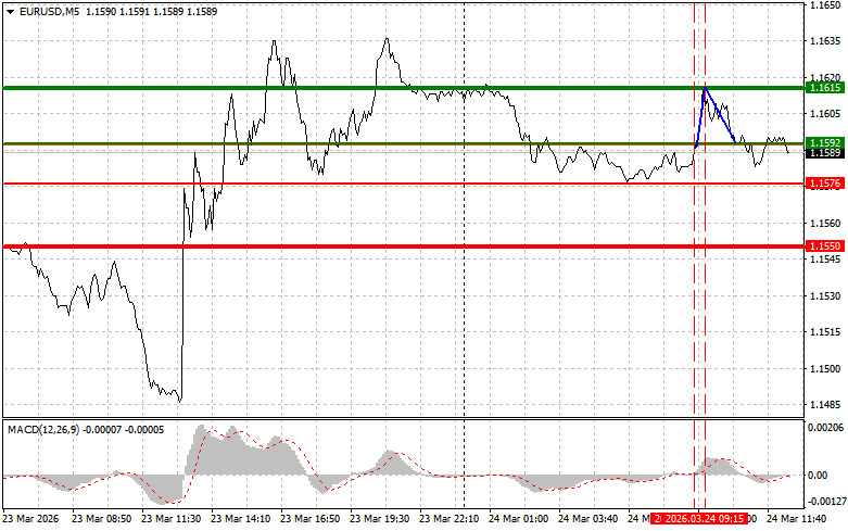 Разбор сделок и советы по торговле европейской валютойТест цены 1.1592 пришелся на момент, когда индикатор MACD только начинал движение вверх от нулевой отметки, что стало подтверждением правильной точки входа на покупку евро. В результате пара выросла в район целевого уровня 1.1615. Продажи оттуда на отскок позволили утянуть с рынка еще более 20 пунктов прибыли.Покупатели европейской валюты показали некоторую активность в начале торговой сессии в Европе, однако после публикации разочаровывающих показателей индексов PMI по еврозоне, давление на пару быстро вернулось. Это