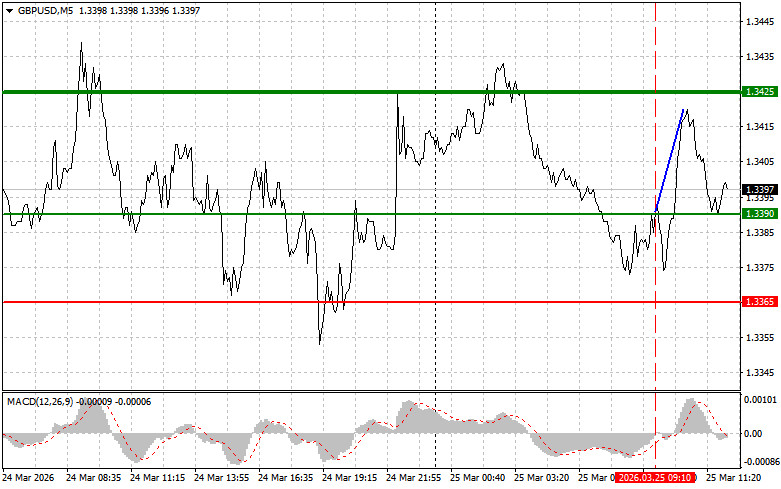 Разбор сделок и советы по торговле британским фунтомТест цены 1.3390 пришелся на момент, когда индикатор MACD только начинал движение вверх от нулевой отметки, что стало подтверждением правильной точки входа на покупку фунта. В результате пара выросла на 30 пунктов. Публикация сведений о росте индекса потребительских цен в Великобритании до 0,4% в феврале текущего года вызвала незначительный спрос на фунт стерлингов. Тем не менее существенного укрепления валютной пары не произошло, поскольку представленная статистика соответствовала ожиданиям аналитиков. Рынок, похоже, уже заложил в