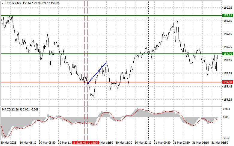 Разбор сделок и советы по торговле японской иенойТест цены 159.48 пришелся на момент, индикатор MACD много прошел вниз от нулевой отметки, что ограничивало нисходящий потенциал пары. Второй тест 159.48 совпал с моментом нахождения MACD в области перепроданности, что привело к реализации сценария №2 на покупку доллара. В результате пара выросла лишь на 15 пунктов.Японская иена продемонстрировала некоторое укрепление против доллара США, что стало следствием неоднозначных заявлений президента Трампа относительно Ближнего Востока. Напряженность вокруг Ормузского пролива остается главным моментом, который оказывает