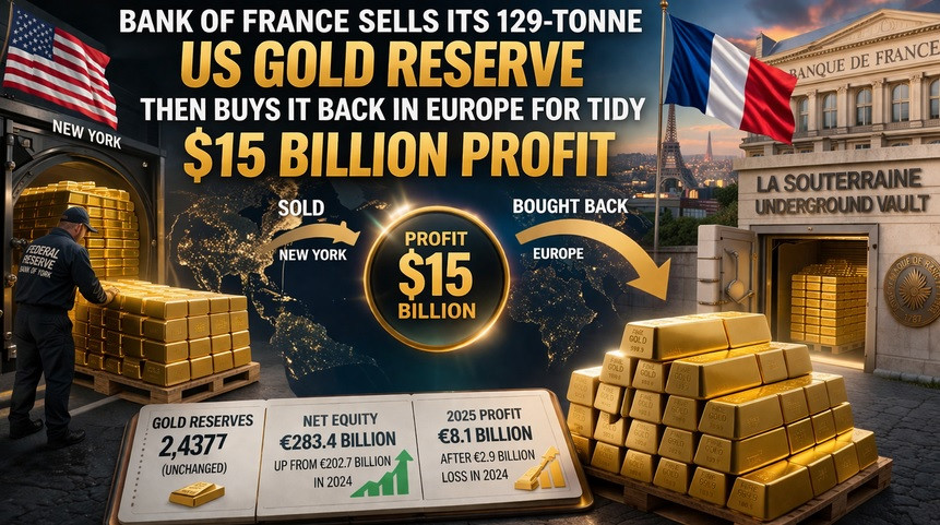 Банк Франции нашел элегантный способ вывести часть своих золотых резервов из-под хранения в США, не создавая при этом дипломатического шума: регулятор просто продал металл с прибылью в Нью-Йорке, а затем выкупил его обратно в Европе. В рамках публикации результатов за 2025 финансовый год центральный банк сообщил об «исключительной статье», которая позволила развернуть убыток в 2,9 миллиарда евро в годовую прибыль в 8,1 миллиарда евро. «Доход от активов, находящихся на собственном счете, увеличился на 12,2 миллиарда евро за счет исключительной статьи»,