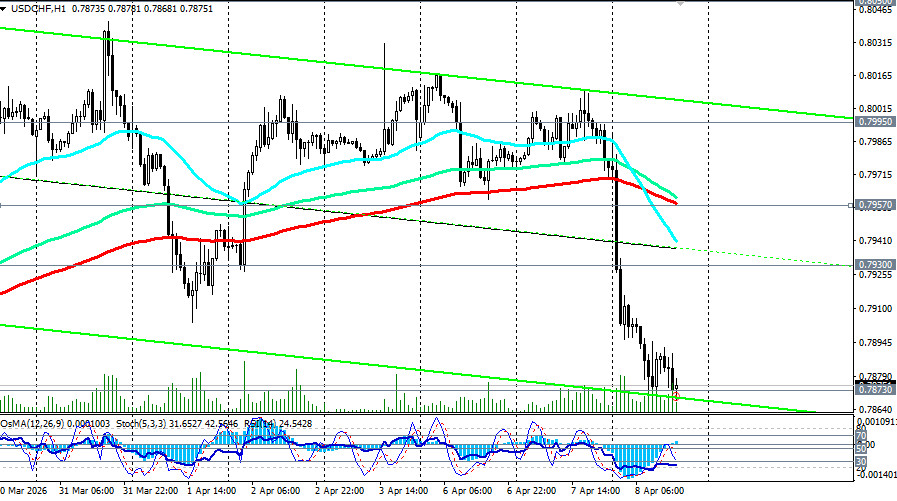 Двухнедельное перемирие между США и Ираном обрушило доллар и нефть, а технический пробой восходящего тренда USD/CHF подтвердил смену настроений, отметили мы в нашем сегодняшнем фундаментальном анализе и обзоре «USD/CHF: перемирие с Ираном обрушило доллар и нефть». В то же время, USD/CHF остаётся торговаться в зоне медвежьего рынка, среднесрочного - ниже ключевого уровня сопротивления 0.7995 (ЕМА200 на дневном графике), долгосрочного - ниже ключевого уровня сопротивления 0.8615 (ЕМА200 на недельном графике). Это сохраняет преимущество коротких позиций. Пробой важного уровня