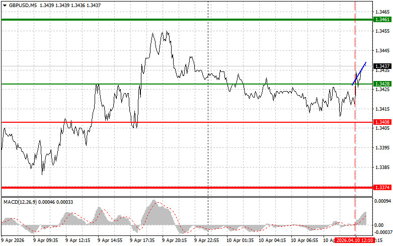 Разбор сделок и советы по торговле британским фунтомТест цены 1.3428 пришелся на момент, когда индикатор MACD только начинал движение вверх от нулевой отметки, что стало подтверждением правильной точки входа на покупку фунта. Однако до крупного роста пары дело пока так и не дошло.Далее нас ждут первые данные по инфляции в США. Ожидаются цифры по мартовскому индексу потребительских цен, индексу потребительских цен без учета цен на продукты питания и энергоносители, индексу настроения потребителей от Университета Мичигана и инфляционные ожидания. Эти показатели