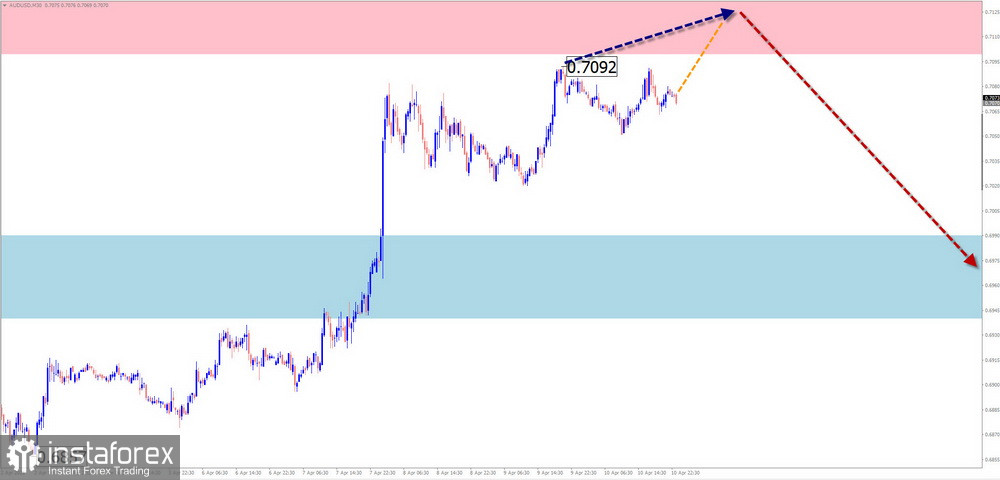 Основное направление ценовых колебаний основной пары австралийского доллара с весны прошлого года задавал алгоритм восходящей волны. С конца января навстречу основному курсу развивается коррекционная волна. Её структура на момент анализа не выглядит завершённой. Цена приближается к мощной зоне потенциального разворота крупного ТФ.