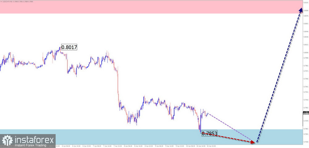 В краткосрочной перспективе актуальная волна швейцарского франка с апреля прошлого года направлена вверх. Волна корректирует более крупную медвежью конструкцию недельного ТФ. Структура волны находится в заключительной фазе. В районе расчётного сопротивления проходит нижняя граница мощной потенциально-разворотной зоны крупного масштаба.