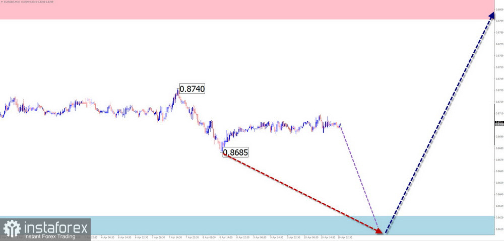 Направление движения кроссовой пары евро/английский фунт с 19 марта текущего года задаётся алгоритмом нисходящей волны. Волна развивается в боковой плоскости. В структуре волнового зигзага формируется начало заключительной части (С). Расчётная зона сопротивления находится у нижнего края потенциально-разворотной зоны недельного масштаба графика.