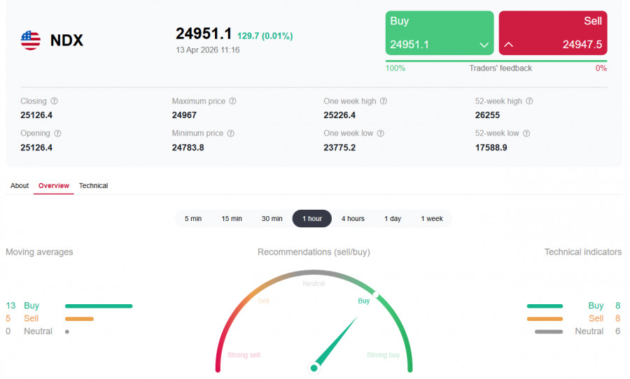 *) см. также: Торговые индикаторы InstaForex по NASDAQ100 (NDX) Фьючерсы на основные американские фондовые индексы вступают в новую неделю в крайне уязвимом положении. Так, после оптимистичного рывка на прошлой неделе, вызванного новостями о двухнедельном перемирии, фьючерсы на индекс NASDAQ100 (NDX в торговом терминале) в понедельник утром резко ушли вниз. В азиатскую сессию они торговались на уровне 24950.0, снижаясь на 1,10%. Причина — полный провал мирных переговоров между США и Ираном в Исламабаде и последовавшая за этим эскалация
