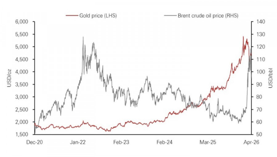 Золото отметилось худшим дневным падением за две недели на фоне срыва переговоров США и Ирана, «ястребиной» риторики Кевина Уорша перед Банковским комитетом Сената и взлета американских розничных продаж в марте наиболее быстрыми темпами, по меньшей мере, за год. Американская экономика сильна, ФРС вряд ли будет снижать ставки, а рост цен на нефть поддерживает доллар. В такой обстановке XAU/USD чувствует себя не в своей тарелке.Динамика золота и нефти Давление на драгметалл со стороны растущей нефти проявляется