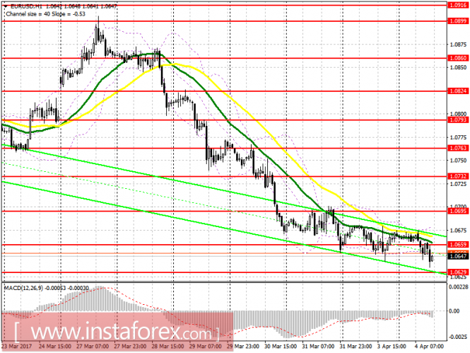 Продавцы пытаются удержать торговый инструмент ниже, у прошлой поддержки, а теперь у сопротивления, уровня 1.0659. В связи с этим ожидать дальнейшего снижения евро можно в районах 1.0629 и 1.0605. Первый удар по стоп-приказам продавцов произойдет лишь после возврата EUR/USD на уровень 1.0659. В случае более крупного роста евро во второй половине дня возвращаться к коротким позициям рекомендую только после теста 1.0695.