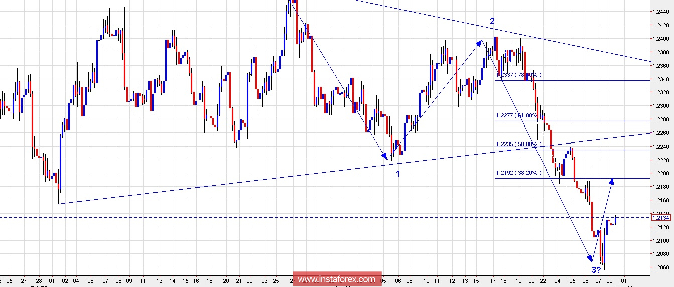 The EUR/USD H4 chart might be indicating a short-term pullback rally in the counter as expected and discussed on Friday. The pair has produced a morning star candlestick pattern on this time frame and has exceeded 1.2130 levels in terms of price action, breaking above the first interim resistance at 1.2130 levels. We are expecting a small corrective dip towards 1.2080 now, carving out a potential higher low, before extending this corrective rally through 1.2190/1.2200 levels. Aggressive short-term traders who went long on Friday as suggested can hold positions accordingly, while conservative traders should wait for another higher price to enter short again. Looking into the wave count, the pair seems to have completed waves 1,2 and 3 of the same degree now, and that wave 4 is in progression now. A safe strategy is to watch out for higher prices to sell again.