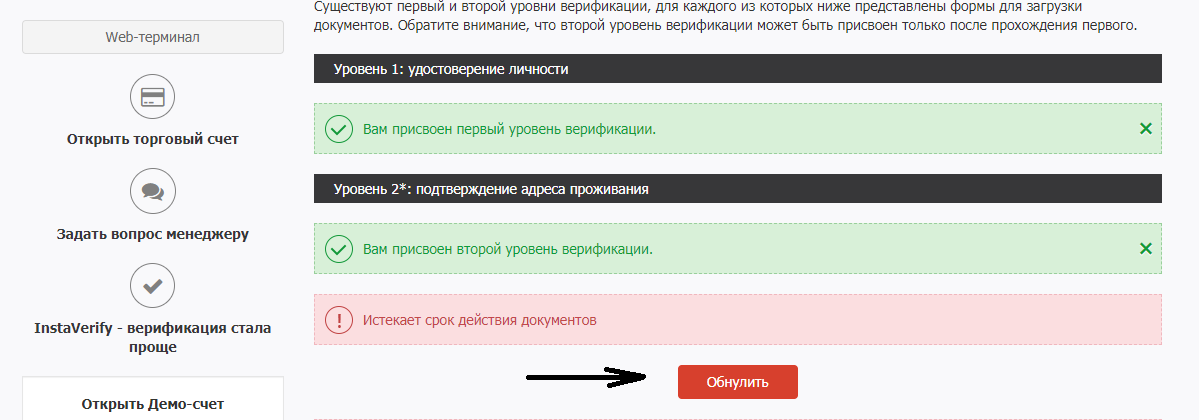 Во избежание задержек с вводом и выводом средств настоятельно рекомендуем загрузить обновленные документы. Для этого вам необходимо зайти в Клиентский кабинет, раздел Верификация счета и нажать кнопку “Обнулить”. В этот момент ваша верификация будет сброшена, и у вас появится возможность на этой же странице загрузить новый документ.
