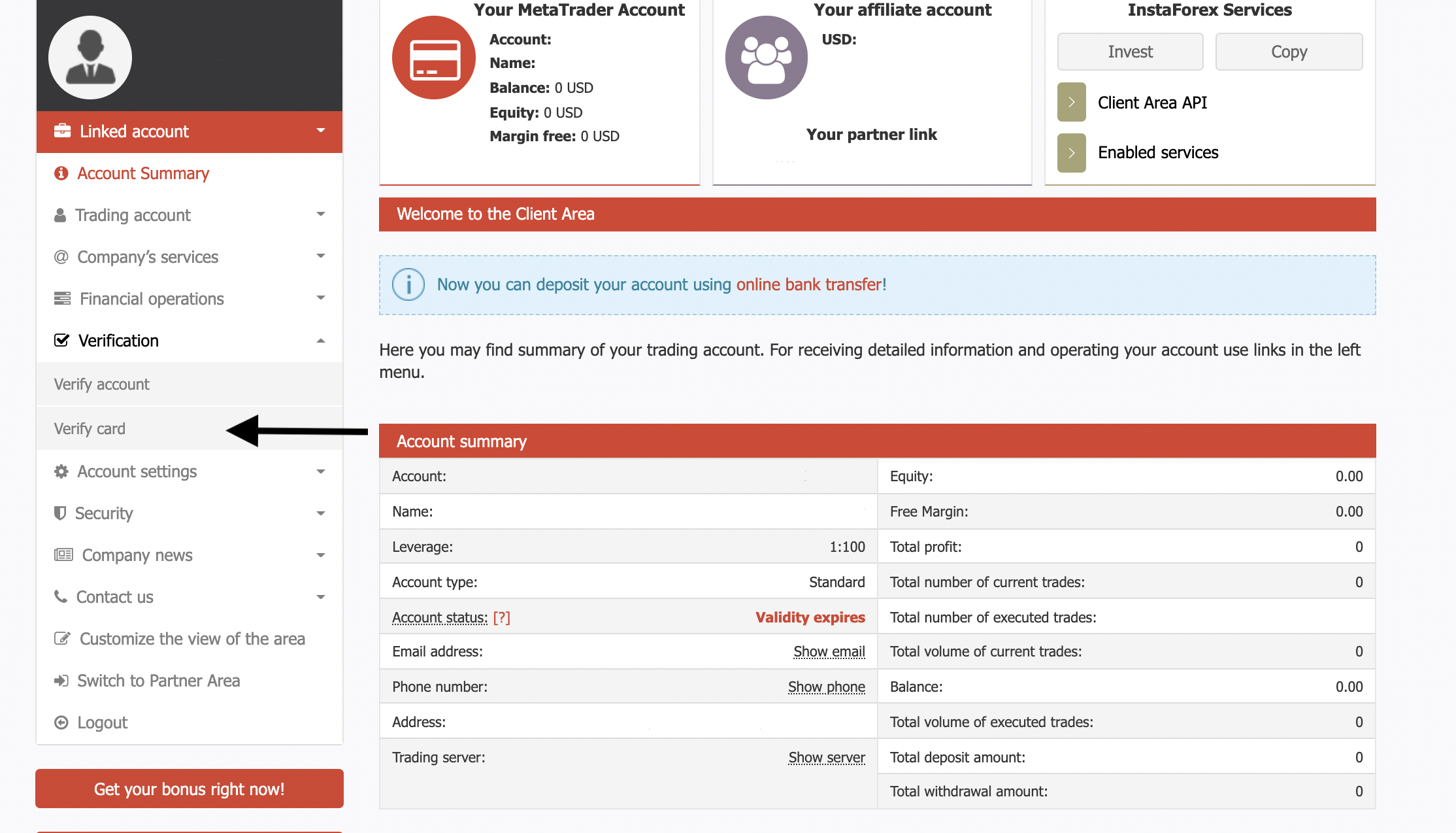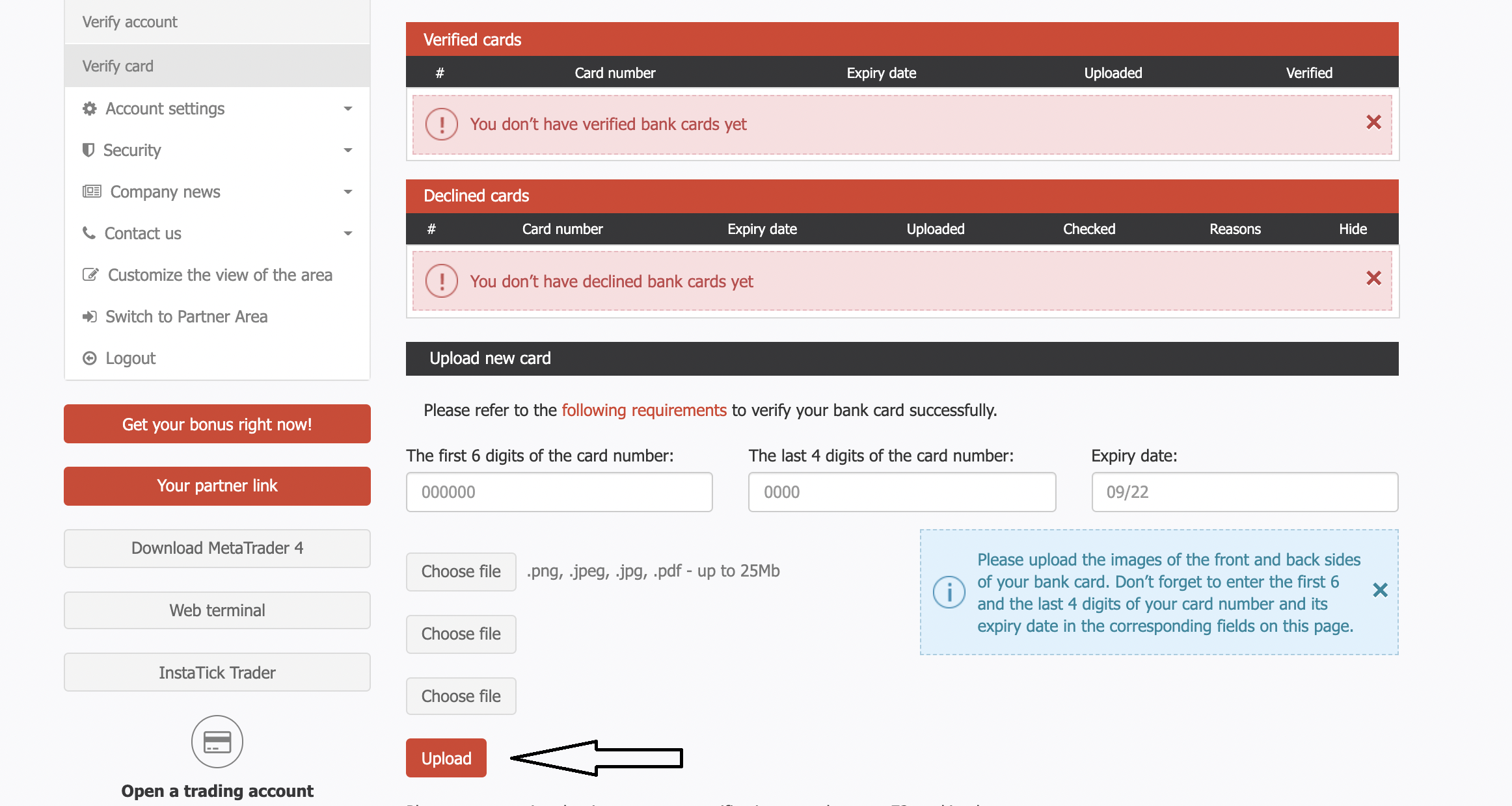 Pentru a încărca o fotografie a cardului dumneavoastră bancar, vă rugăm să vă conectați la zona de clienți, alegeți Verificare în meniul din stânga și apoi faceți click pe Verificare card. Pe această pagină web, veți putea încărca fotografiile fața-verso a cardului dumneavoastră bancar. Nu uitați să ascundeți datele sensibile pe imagini.