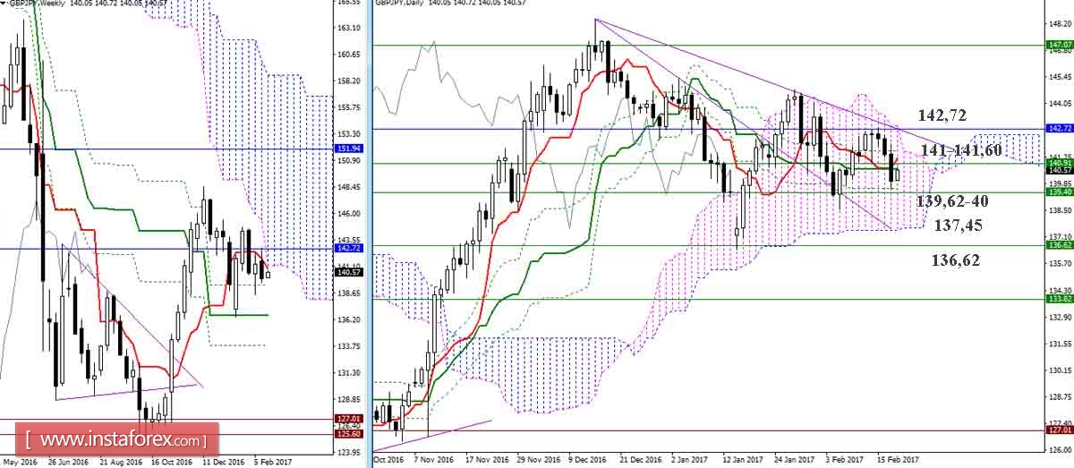 В пятницу медведи взяли реванш и исполнили снижение до заключительного рубежа дневного креста (Фибо Киджун 139,62), усиленного недельным уровнем (139,40). Преодоление данных поддержек позволит рассмотреть снижение к нижней границе дневного облака (Сенкоу Спан Б 137,45) и недельному среднесрочному тренду (136,62). Важная зона сопротивлений для игроков на повышение сейчас расположена в районе 141-141,60 (недельный Киджун + дневной Тенкан + дневной Фибо Киджун), далее своё значение по-прежнему сохраняет объединение сразу нескольких сопротивлений – месячного Тенкана (142,72), трендовой линии, отсекающей недельную коррекцию, и верхней границы дневного облака.