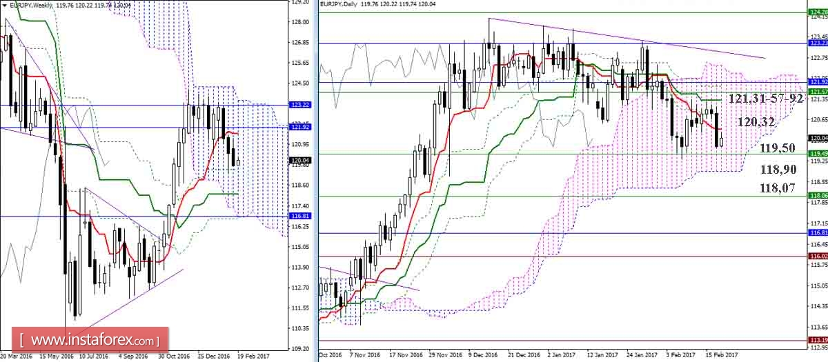 Медведи в пятницу проявили характер и практически вернули пару к недельному Фибо Киджуну (119,50). Преодоление данного уровня позволит медведям протестировать нижнюю границу дневного облака (118,90) и рассмотреть возможности для снижения к поддержке недельного среднесрочного тренда (118,07). Ближайшим сопротивлением сейчас является дневной Тенкан (120,32). Наиболее укреплённая зона противостояния, объединяющая уровни всех старших временных интервалов, сохранила сегодня своё расположение (121,31-57-92).