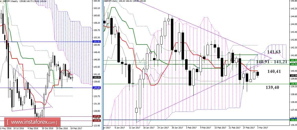 Ситуация не получила развития, поэтому выводы и ожидания, озвученные вчера, сохранились. Сегодня закрываем неделю. Для развития медвежьих настроений наиболее выгодно закрытие недели под поддержкой 139,40 (недельный Фибо Киджун). Сопротивления позволяющие вернуть перспективы игрокам на повышение не изменили своего расположения – 140,41 (дневной Тенкан) – 140,91-141,21 (недельный Тенкан и Сенкоу Спан А) – 141,63 (дневные Киджун + Сенкоу Спан Б).