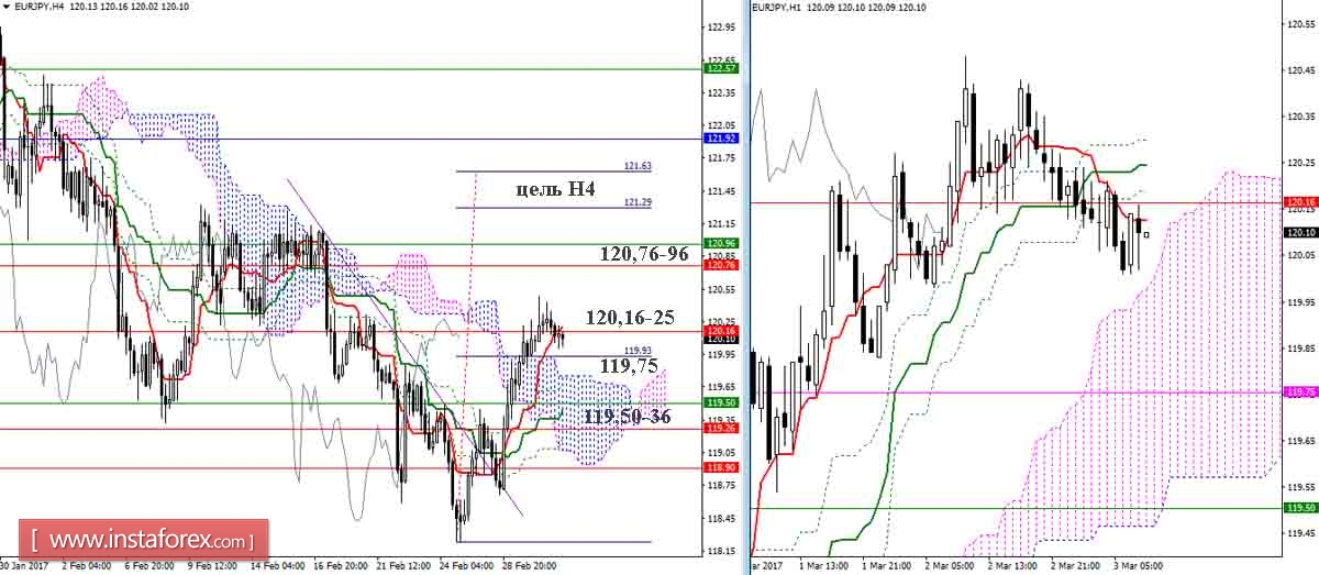 На младших таймфреймах созданы предпосылки для развития нисходящей коррекции. Но уровни позволяющие изменить перевес сил и вернуть поддержку быкам сейчас расположены достаточно близко – 120,16-25 (Тенкан Н4 + Киджун Н4 + дневные уровни). В случае закрепления выше 120,16-25 повышательные ориентиры пока не изменились – сопротивление 120,76-96 (дневной Киджун + недельный Тенкан) и цель на пробой облака Н4. Если нисходящая коррекция сегодня получит развитие, то её ориентирами станут 119,75 (Сенкоу Спан Б Н4) и зона 119,50-36 (Киджун Н4 + уровни старших таймов).
