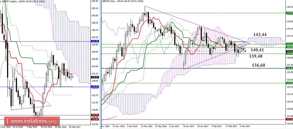 За последние несколько суток сложилось боковое движение – кресты Ишимоку меняют друг друга почти в горизонтальной плоскости, рынок закручивается вокруг облака Н1. В настоящий момент незначительное преимущество находится на стороне медведей, так как пара располагается в медвежьей зоне относительно облаков младших таймфреймов. Основная задача для игроков на понижение сейчас заключается в преодолении поддержки 139,40 и обновлении минимальных экстремумов (138,81 и 138,51). Завладеть начальным преимуществом и сформировать повышательные цели (цели на пробой облаков Н4 и Н1) игроки на повышение смогут, если перейдут в бычью зону относительно облаков Н4 и Н1, которые сейчас усилены сопротивлениями старших таймов 140,41-60.