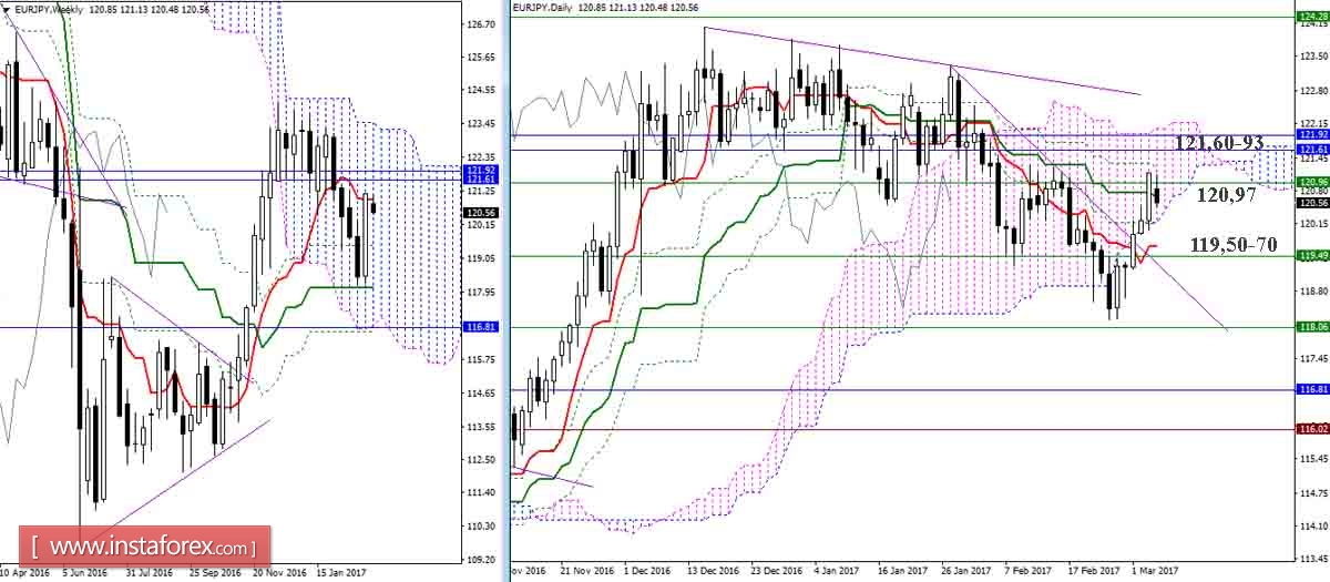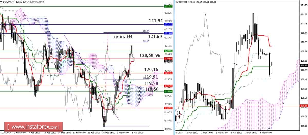 В настоящий момент игроки на повышение пытаются сохранить поддержку Тенкана Н4 (120,60) и креста Н1. Преодоление уровней сопротивлений старших таймов (120,70-96) открывает дорогу для исполнения цели Н4 (121,29-63), с последующим подъёмом к месячному облаку (121,92). Закрепление под поддержками (120,60) создаёт предпосылки для развития коррекции. Поддержки расположены сегодня в следующей последовательности 120,16 – 119,91 – 119,70 – 119,50.