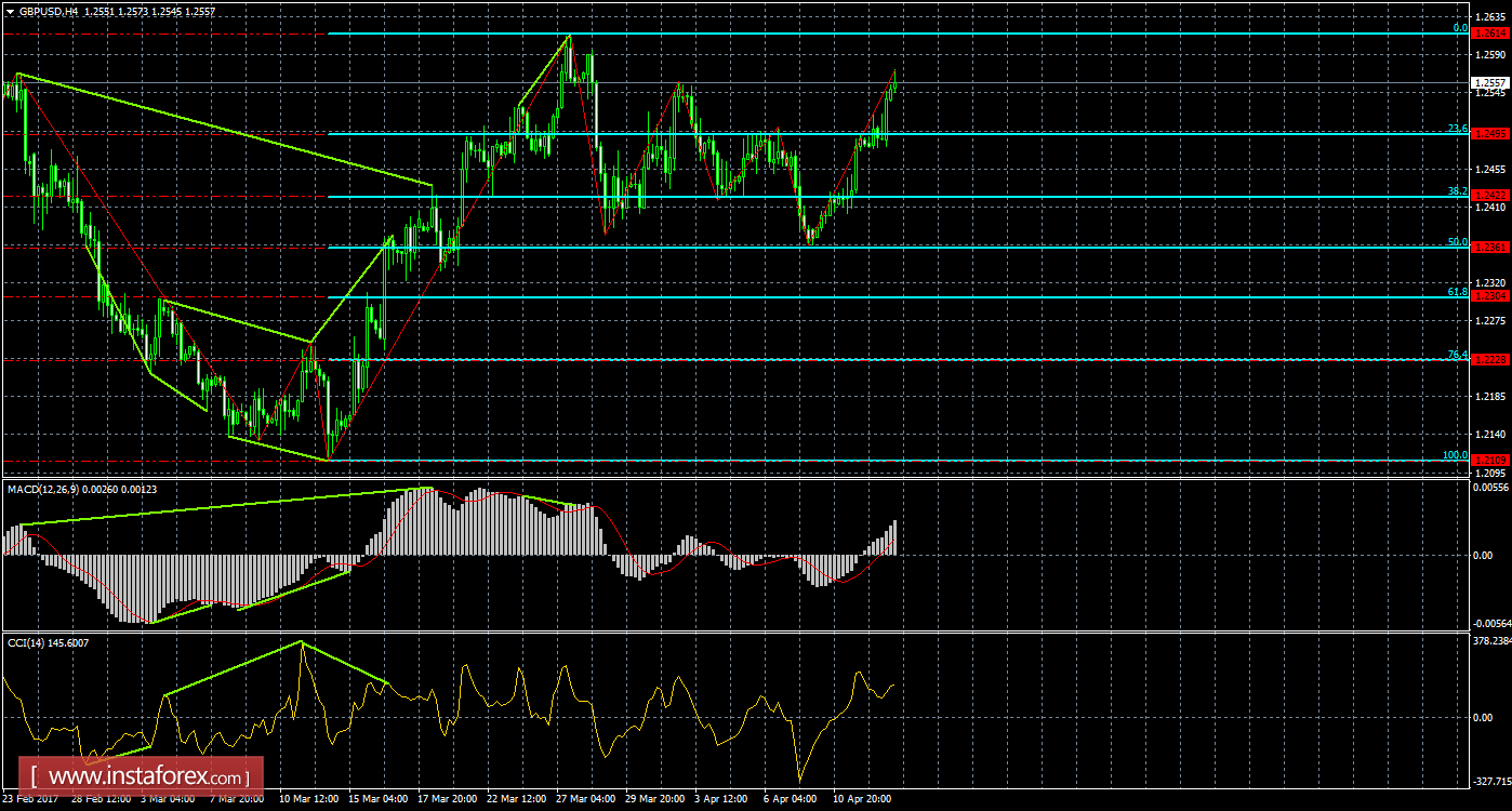На 4-часовом графике котировки выполнили закрепление над уровнем Фибо 23,6% - 1,2495. Назревающих дивергенция отменилась. А рост котировок 13 апреля может быть продолжен в направлении уровня коррекции 0,0% - 1,2614. Закрепление курса над уровнем Фибо 0,0% сработает в пользу продолжения роста котировок, а сетка Фибо уровней будет построена новая. Отбой пары от уровня коррекции 0,0% может сработать в пользу американской валюты и возобновления падения в направлении коррекционных уровней 23,6% - 1,2495 и 38,2% - 1,2422.