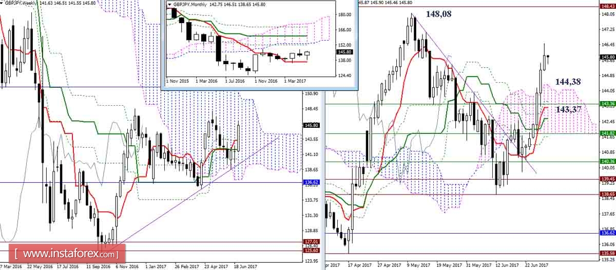 Вчера пара продолжила подъём и обозначила новый дневной максимум. Сегодня закрываем неделю и месяц. Игрокам на повышение сейчас желательно сохранить позитивный настрой и сформировать свечи, подтверждающие бычьи преимущества и перспективы. Ближайшим повышательным ориентиром старших таймфреймов сейчас является максимальный экстремум (148,08), закрепившись выше уровня, игроки на повышение восстановят недельный восходящий тренд, после этого актуальными станут другие ориентиры и цели. Наиболее важными поддержками сегодня по-прежнему являются дневное облако и недельный крест (ближайшие уровни Сенкоу Спан А 144,38 + недельный Тенкан 143,37).