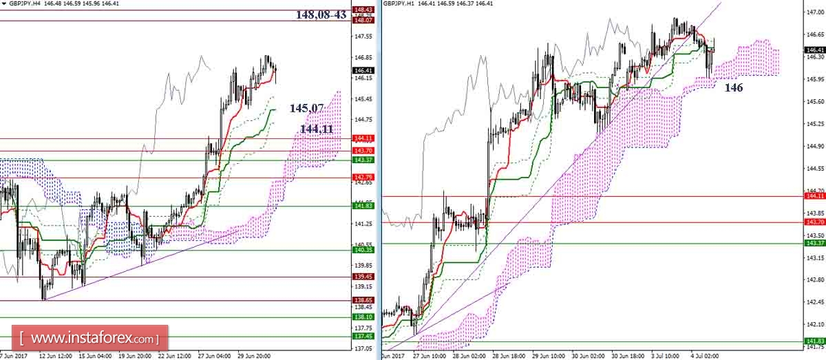 Наиболее значимая поддержка младших таймов сегодня расположена на 146, закрепление ниже сформирует понижательную цель дня снижения на Н1 и лишит быков краткосрочной поддержки на Н4. Исполнение цели на пробой облака Н1 приведёт пару к Киджуну Н4 (145,07). В случае преодоления 145 поддержкой выступит облако Н4, усиленное дневным Сенкоу Спан А (144,11).