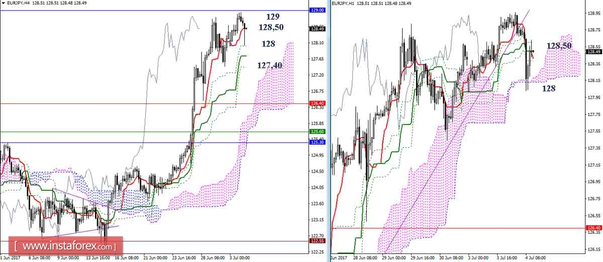Закрепление под 128,50 (Тенкан Н4 + крест Н1) позволит надеяться на развитие коррекции, а преодоление облака Н1(128), усиленного Фибо Киджуном Н4, сформирует цель на пробой. Цель на пробой облака Н1, совместно с заключительными рубежами золотого креста Н4 и облаком Н4, обозначит наиболее благоприятный уровень поддержки при снижении. Снижение в пределах данного уровня лучше всего позволит игрокам на повышение сохранить свои планы, закрепление ниже потребует новой оценки ситуации.