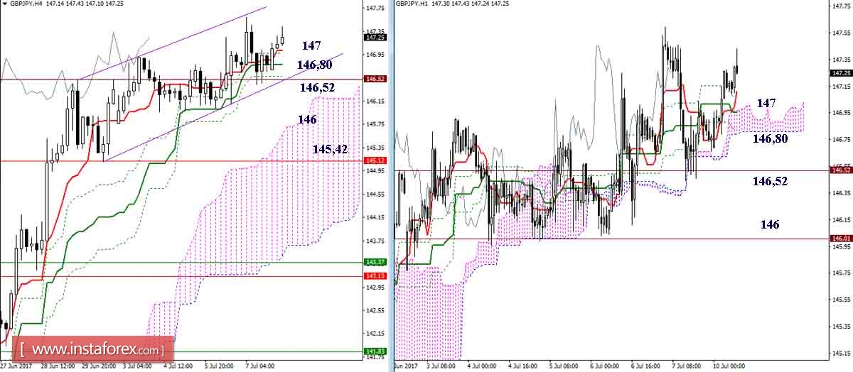 Индикатор Ишимоку продолжает поддерживать игроков на повышение, но уровни, способные повлиять на смену настроений, сейчас буквально поджимают быков. Поддержки сегодня расположены на 147 (Тенкан Н4 + Киджун Н1) – 146,80 (Киджун Н4 + Сенкоу Спан Б Н1) – 146,52 (Фибо Киджун Н4 + исторический уровень). Закрепление ниже изменит баланс сил на младших таймах и будет способствовать развитию медвежьих настроений, ориентирами для снижения в этом случае станут облако Н4 (район 146) и дневной Тенкан (сегодня он на 145,42).