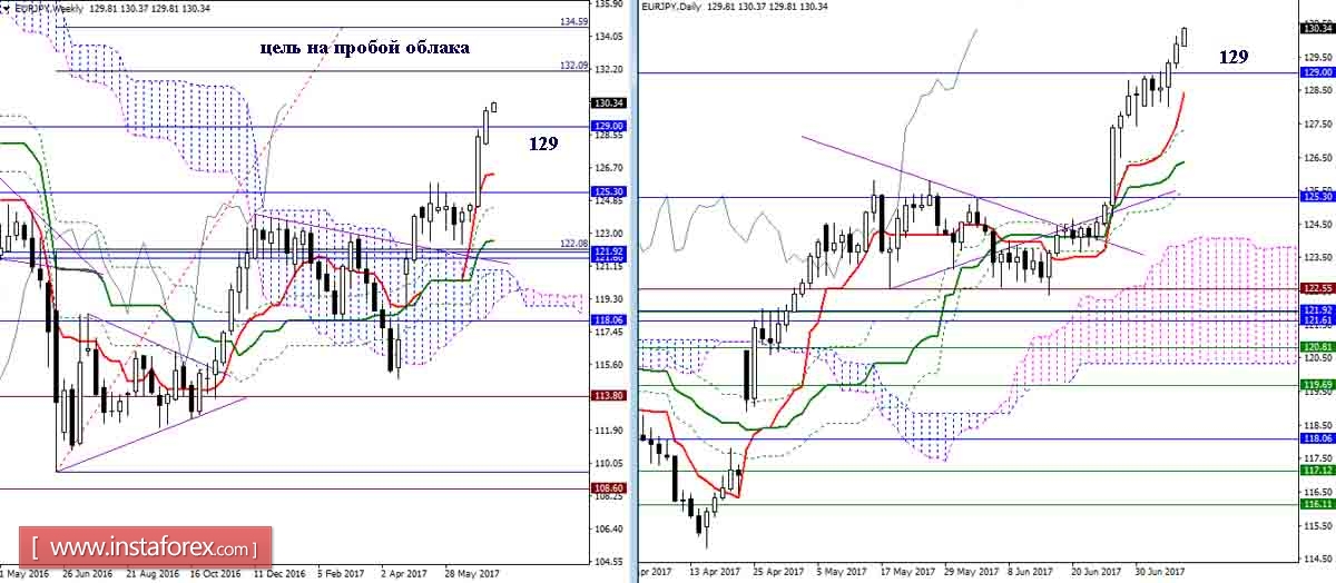 Пара вышла за пределы 129 (месячный Фибо Киджун) и продолжила подъём. Уровень 129 для таймфреймов младше месяца превращен сейчас в поддержку. Желанной перспективой для игроков на повышение в настоящий момент является цель на пробой недельного облака (первый повышательный ориентир 132,09 + 100% цели 134,59).