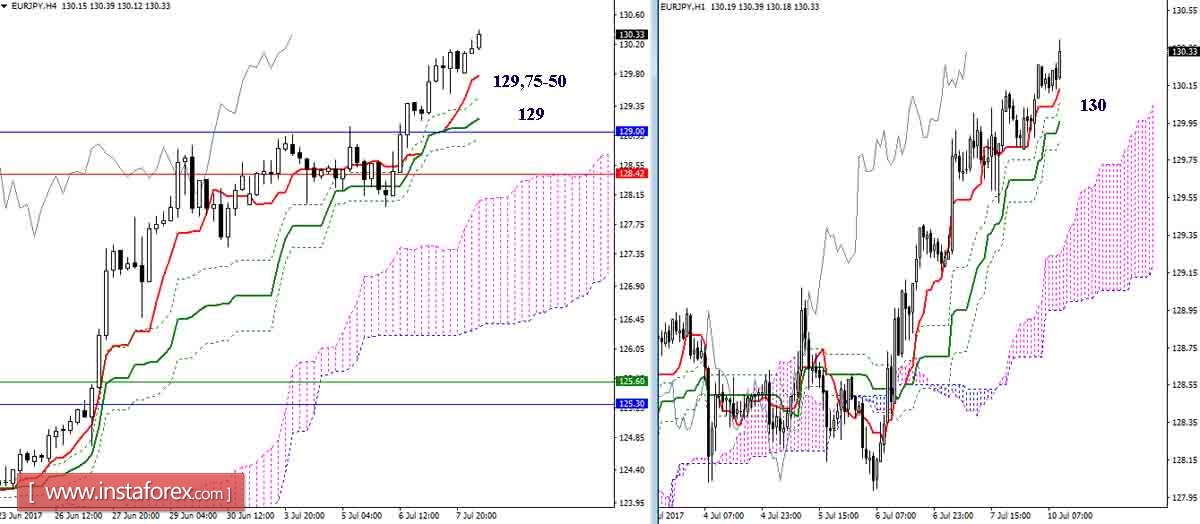В текущей ситуации наблюдаем активную фазу восходящего тренда, поддержка индикатора Ишимоку на стороне игроков на повышение. Повышательные цели и ориентиры младших таймфреймов давно отработаны, роль Н4 и Н1 сейчас заключается в формировании уровней поддержек. Ближайшую поддержку (в районе 130) образует крест Н1, далее нужно отметить 129,75 -50 (Тенкан Н4 + Фибо Киджун Н4 + верхняя граница облака Н1), но наиболее укреплённым сегодня является рубеж 129 (заключительные уровни креста Н4 + нижняя граница облака Н1 + месячный Фибо Киджун).