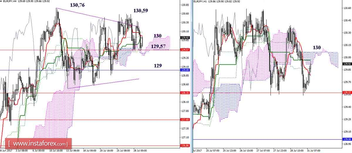 Уровни поддержки 129,58 (облако Н4 + дневной Тенкан) и 129 (месячный Фибо Киджун) продолжают играть ключевую роль в распределении сил. Пока пара находится выше, игроки на повышение сохраняют шансы оказаться победителями в данном противостоянии. Среди сопротивлений сегодня можно отметить 130,00 (Тенкан Н4 + Сенкоу Спан Б Н1) – 130,59 (максимум) – 130,76 (максимум). Спуск под 129,58-40 вернёт поддержку индикатора Ишимоку младших таймов на сторону игроков на понижение, после этого основной задачей станет преодоление 129 и снижение к другим поддержкам дневного креста Ишимоку.