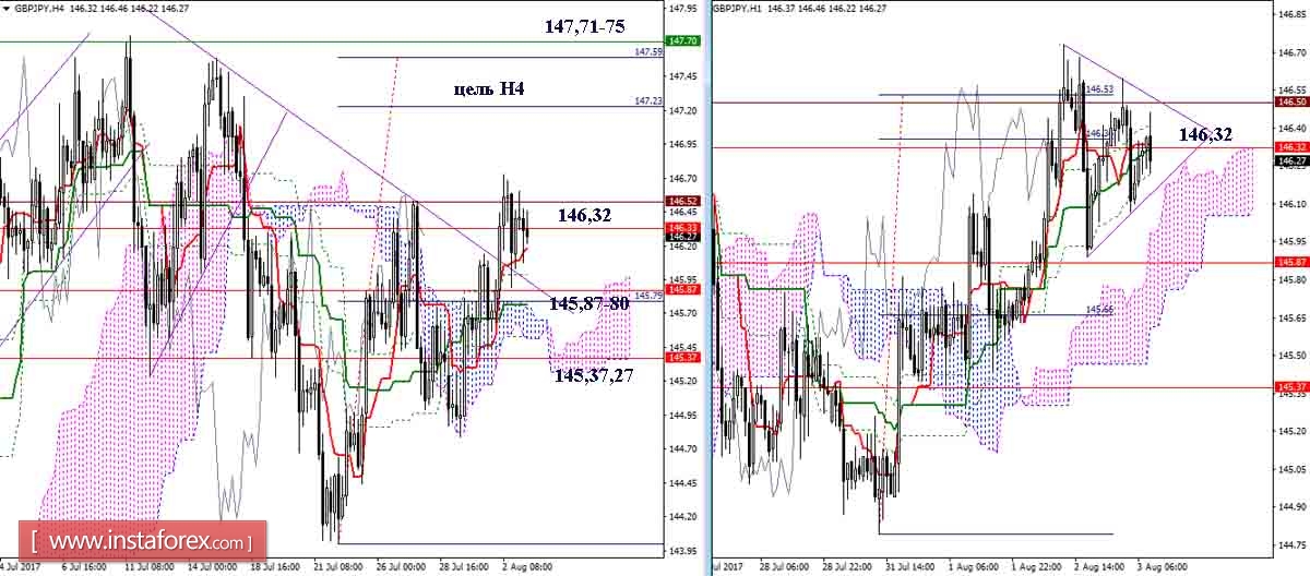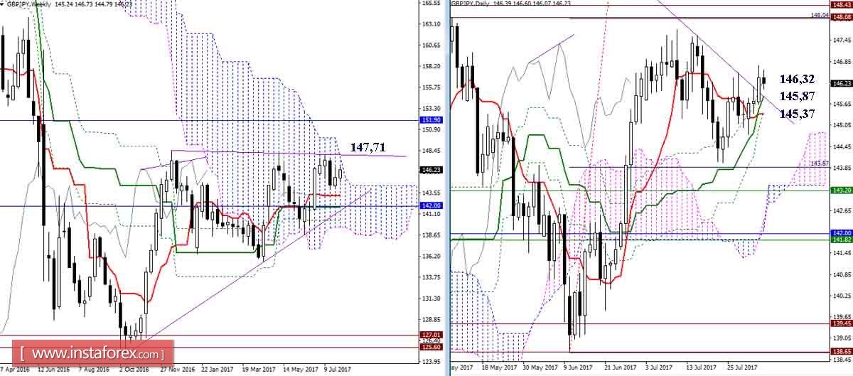 Дневной Ишимоку сформировал мёртвый крест, но угол наклона линий и расположение пары выше креста указывают на его слабость. Преимущества сейчас на стороне игроков на повышение, в задачи которых входит преодоление сопротивления заключительного рубежа дневного креста 146,32 (дневной Фибо Киджун) и подъём к верхней границе недельного облака (147,71). Роль поддержек в настоящий момент выполняют уровни дневного креста Ишимоку (Киджун 145,87 + Тенкан 145,37). Закрепление под поддержками может повлиять на баланс сил и последующее развитие ситуации.