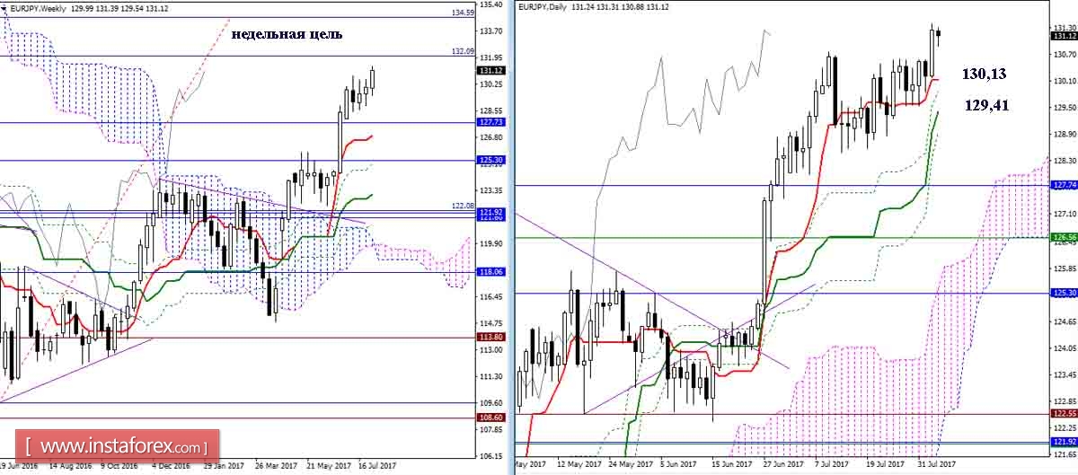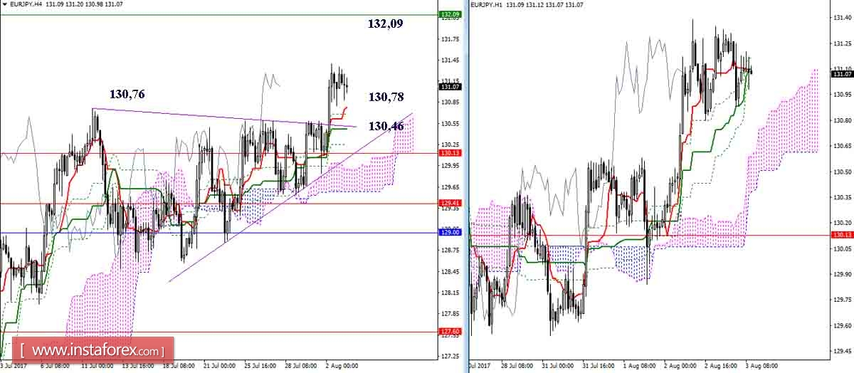 Среди поддержек на младших таймфреймах сегодня можно отметить 130,78 (Тенкан Н4 + верхняя граница облака Н1) и 130,46 (Киджун Н4 + нижняя граница облака Н1).