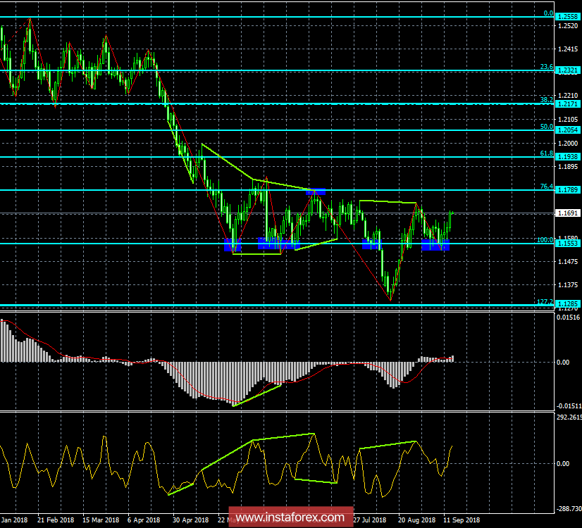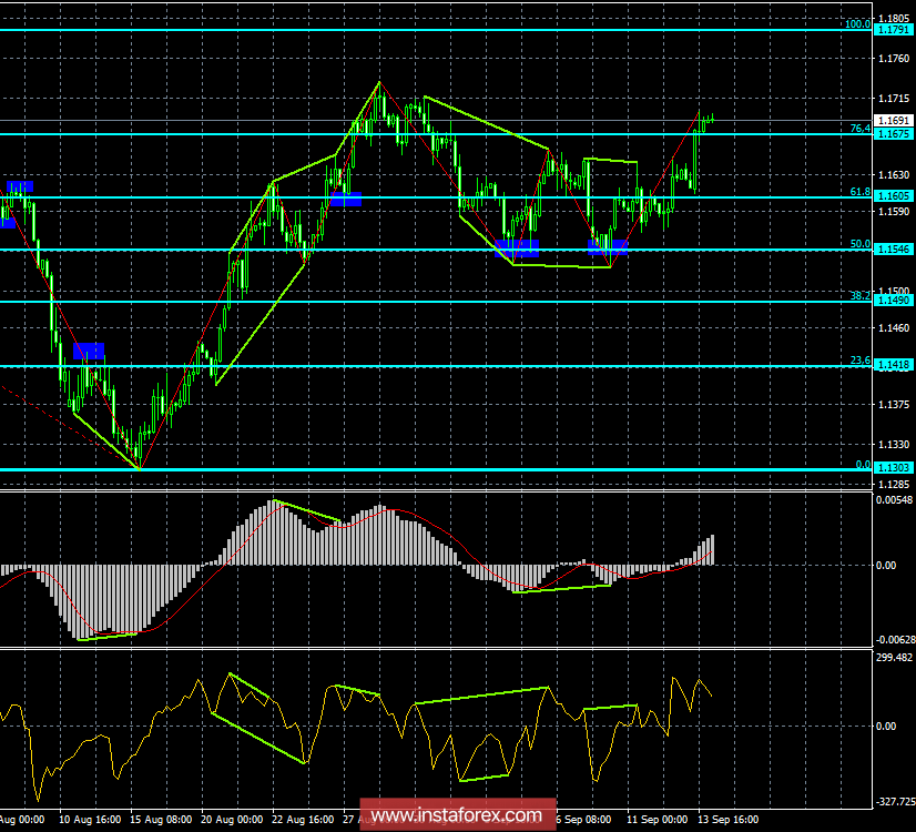 Пара EUR/USD на 4-часовом графике выполнила закрепление над коррекционным уровнем 76,4% - 1,1675. Таким образом, 14 сентября процесс роста может быть продолжен в направлении следующего уровня коррекции 100,0% - 1,1791. Назревающих дивергенций сегодня не наблюдается ни у одного индикатора. Закрепление курса пары под уровнем Фибо 76,4% можно будет трактовать как разворот в пользу валюты США и ожидать некоторое падение в направлении уровня коррекции 61,8% - 1,1605.