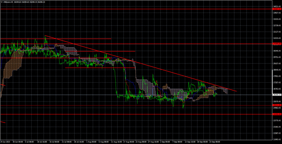 На 4-годинному таймфреймі криптовалюта почала виток висхідного руху, який вже може бути завершено. Ми вважаємо, що тепер можна розглядати покупки тільки в разі подолання низхідної лінії тренду. У цьому разі зростання продовжиться з цілями $28 500 і $31 000. Доти, доки цього не сталося, а також з урахуванням відскоку від лінії тренда, ми радимо продавати в короткостроковій перспективі з метою $25 211.