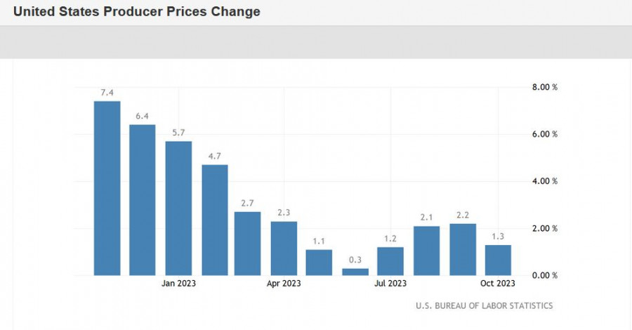 Опубликованный сегодня инфляционный отчёт послужил очередным подтверждением того, что инфляция в США замедляется, и, следовательно, острой необходимости в дополнительном ужесточении ДКП – нет. Собственно, об этом же свидетельствуют и данные CME FedWatch Tool. После публикации отчёта по росту индекса потребительских цен в октябре вероятность повышения процентной ставки ФРС на декабрьском заседании резко снизилась – до 5%. Сегодня, после публикации данных по росту индекса цен производителей, вероятность увеличения ставки в следующем месяце снизилась до нуля. Что касается январского заседания, то здесь сложилась аналогичная картина: вероятность сохранения статус-кво составляет 97,8%.