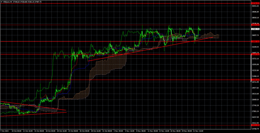 На 4-годинному таймфреймі криптовалюта двічі подолала рівень 35 897$ і двічі не зуміла подолати рівень 38 000$. Таким чином, наразі ціна перебуває в трикутнику, і залежно від того, яку з його меж буде подолано, біткоїн отримає новий імпульс. Відскік від лінії тренда можна використовувати для невеликих покупок. Відскік від рівня 38 000$ ─ для невеликих продажів.