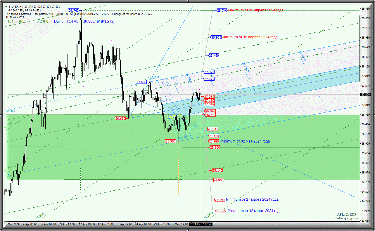 Spot Silver - станем торговать диапазон 27.262 - 27.777? Комплексный анализ - вилы Эндрюса APLs & ZUP - с 8 мая 2024