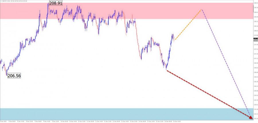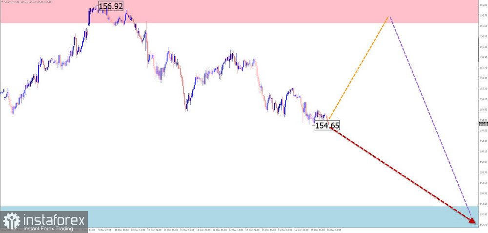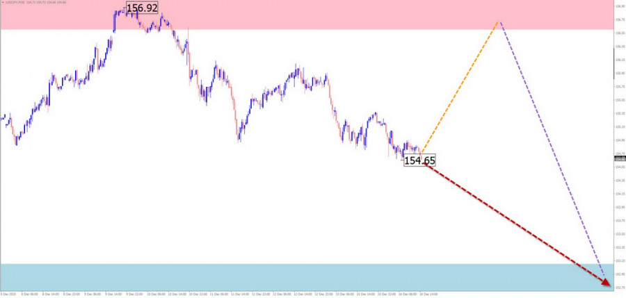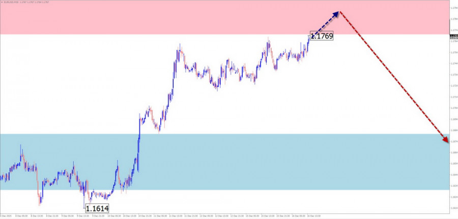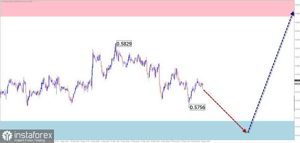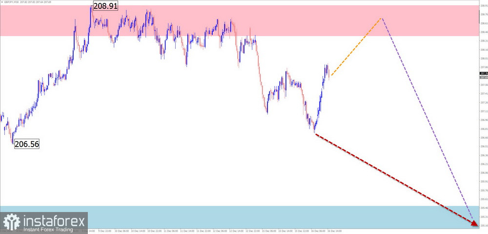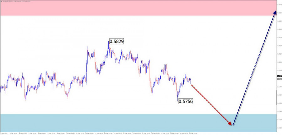 В ближайшие пару дней цену пары ожидает преимущественно "боковик" в ценовом коридоре, обозначенным ближайшими встречными зонами. Возможен кратковременный откат в район расчётного сопротивления. Ближе к выходным можно рассчитывать на возобновление медвежьего курса. Нижней границей ожидаемого недельного входа пары выступает расчётная поддержка.