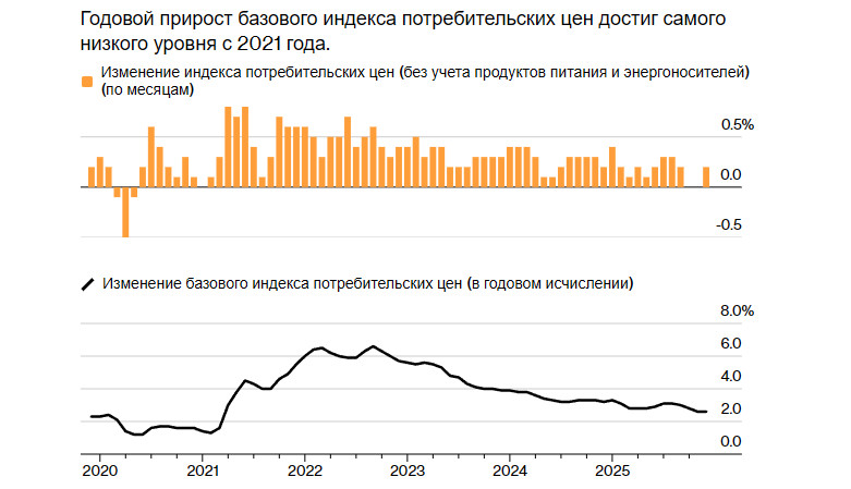 Согласно данным Бюро статистики труда, опубликованным во вторник, базовый индекс потребительских цен, исключающий волатильные категории товаров и энергоносителей, вырос на 0,2% по сравнению с ноябрем. В годовом исчислении он увеличился на 2,6%, достигнув четырехлетнего минимума. Общий индекс потребительских цен оказался выше прогнозов, и вырос на 0,3%.