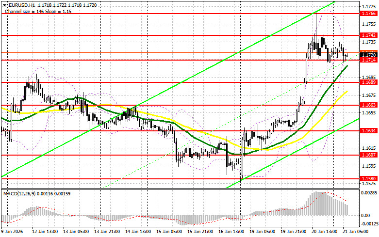 Риски того, что европейские страны, владеющие облигациями и акциями США на триллионы долларов, попытаются использовать эти активы в качестве оружия против торговой политики Трампа вчера подогревали спрос на европейскую валюту и ослабляли позиции доллара целый день. Сегодня в первой половине дня нет никакой статистики по еврозоне, а ожидается лишь выступление президента ЕЦБ Кристин Лагард и президент Бундесбанка Йоахима Нагеля, так что сильного падения евро ожидать не стоит. Скорей всего политики дадут свои комментарии относительно Гренландии, и вряд ли будут касаться процентных ставок. В случае давления на пару надежда покупателей будет смещена на ближайшую поддержку 1.1714, образованную по итогам вчерашнего дня. Формирование там ложного пробоя даст точку входа в длинные позиции с целью восстановления к 1.1742. Прорыв и обратный тест этого диапазона станут подтверждением правильных действий на покупку евро уже в расчете на более крупный рывок к уровню 1.1766, выступающему месячным максимумом. Самой дальней целью выступит максимум 1.1785, где буду фиксировать прибыль. При варианте снижения EUR/USD, и отсутствия активности в районе 1.1714, пара может скорректироваться еще больше, что может привести к более крупному движению евро вниз. В таком случае медведи попытаются дотянуться до следующего интересного уровня 1.1689. Лишь формирование там ложного пробоя будет подходящим условием на покупку евро. Открывать длинные позиции сразу на отскок будут от 1.1663 с целью восходящей коррекции в 30-35 пунктов внутри дня.