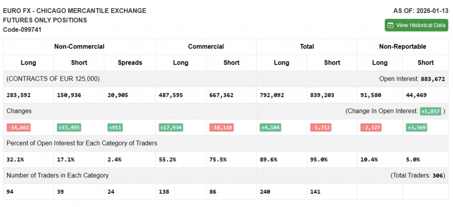 В COT-отчете (Commitment of Traders) за 13 января наблюдался рост коротких позиций и сокращение длинных. Очевидно, что в этом отчете не отражены новые геополитические разногласия между США и ЕС за Гренландию, которые привели к существенному изменению расстановки сил в рынке. Сейчас все внимание трейдеров смещено именно на эту проблему. Что касается денежно-кредитной политики, то она пока отодвинута на второй план, так как вряд ли на следующей неделе ФРС будет что-то в ней менять. В COT-отчете указано, что длинные некоммерческие позиции сократились на 14 661 до уровня 283 592, в то время как короткие некоммерческие позиции выросли на 15 495 до уровня 150 936. В результате спрэд между длинными и короткими позициями вырос на 911.