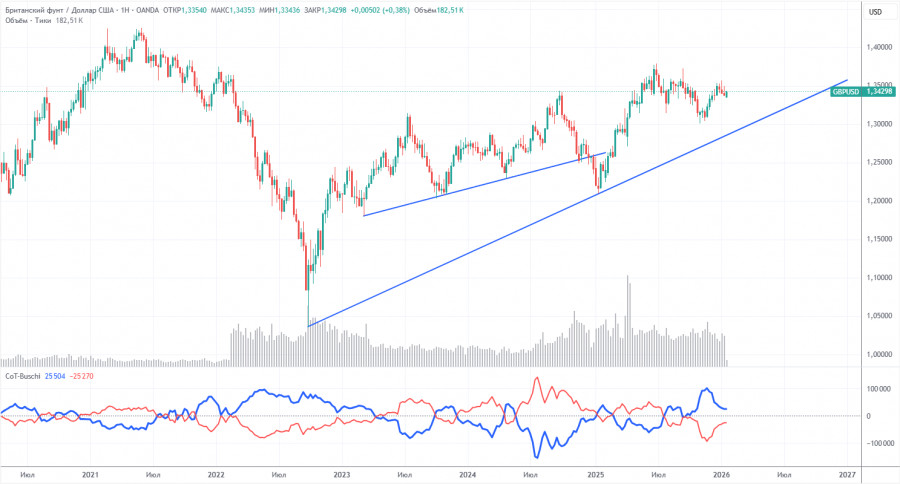 Доллар продолжает снижаться из-за политики Дональда Трампа, что отлично видно на недельном ТФ(иллюстрация выше). Торговая война будет продолжаться в том или ином виде еще долгое время, а ФРС в любом случае будет снижать ставку в ближайшие 12 месяцев. Спрос на доллар так или иначе будет падать. Согласно последнему отчету COT(от 13 января) по британскому фунту, группа «Non-commercial» открыла 2,5 тысячи контрактов BUY и закрыла 2,7 тысячи контрактов SELL. Таким образом, нетто-позиция некоммерческих трейдеров увеличилась за неделю на 5,2 тысячи контрактов.