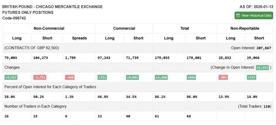 В COT-отчете (Commitment of Traders) за 13 января наблюдался рост длинных позиций и сокращение коротких. Тот факт, что США пока не собираются снижать процентные ставки оказывает давление на фунт и приводит к укреплению доллара. Но в последние дни на первый план вышел новый геополитический конфликт за Гренландию, что вернуло давление на доллар. Покупатели фунта отреагировали на это довольно быстро. Стоит отметить, что при этом политика Банка Англии остается сдержанной, что указывает на их четкие планы по дальнейшей борьбе с инфляцией, хотя особой уверенности покупателям фунта в последнее время это не придает. В последнем COT-отчете указано, что длинные некоммерческие позиции выросли на 2 517 до уровня 79 003, тогда как короткие некоммерческие сократились на 2 751 до уровня 104 273. В итоге спрэд между длинными и короткими позициями снизился на 468.